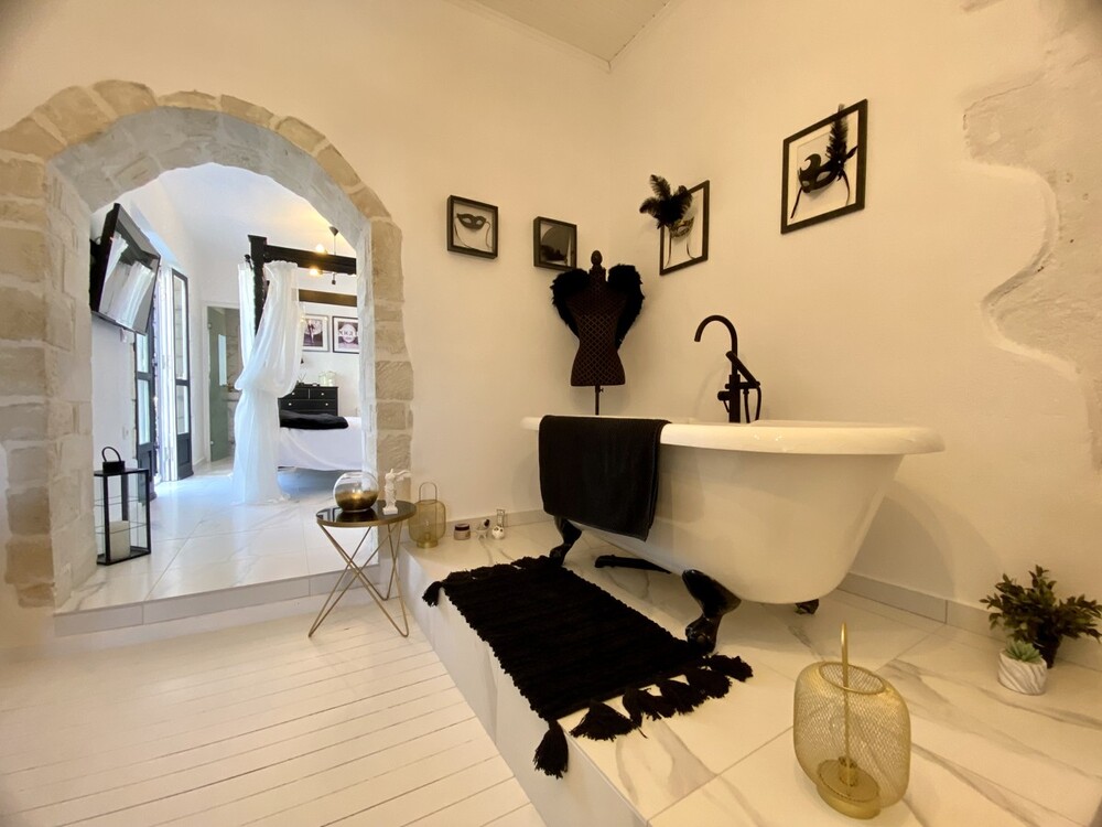 Durch den Haupteingang werden Sie in den wunderschön gefliesten, offenen Wohnbereich mit traditionellen Steinmauern rund um die Eingangstür und Steinbogenwegen, die Sie in die Küche und den Essbereich führen, willkommen heißen. Die Küche ist komplett ausgestattet mit Geschirrspüler, Dunstabzug, integriertem Kochfeld, Backofen, Mikrowelle, freistehendem Kühlschrank mit Gefrierfach, viel Stauraum und einem schönen, maßgefertigten Holzofen. Es gibt eine Wendeltreppe, die in den ersten Stock führt.