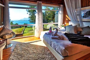 Die Unterkunft verfügt über mehrere Sitz- und Essbereiche im Freien sowie zwei Dachterrassen mit Panoramablick auf das Meer und die Berge.
