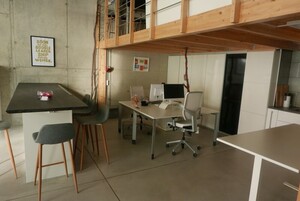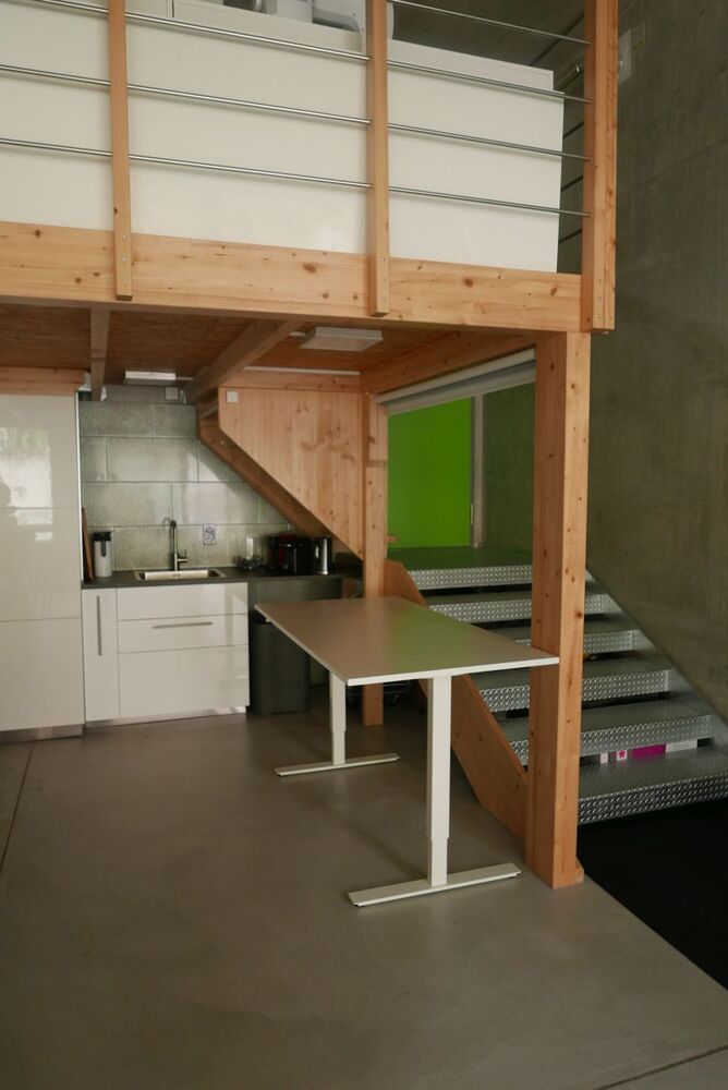 Nebst den Arbeitsplätzen gibt es eine riesige Bar (3m lang), die sich prima eignet für Besprechungen oder Apéros. Ebenfalls habe ich zwei Rollos in grau und weiss als Fotohintergrund. Auf der Galerie ist auch noch Platz um mal eine Besprechung zu machen (ebenfalls Stehtisch), falls grad Hochbetrieb ist.