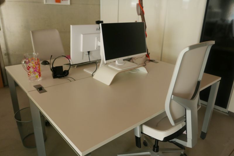 Der eine Arbeitsplatz ist eingerichtet mit Bildschirm, modernem Giroflex Bürostuhl mit Lederbezug, beim zweiten Arbeitsplatz ist erst der Tisch vorhanden (höhenverstellbar).
