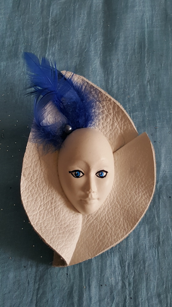 Venezianische Maske aus Tongut mit Lederumkleidung, blaue Federn und blaue Perle.