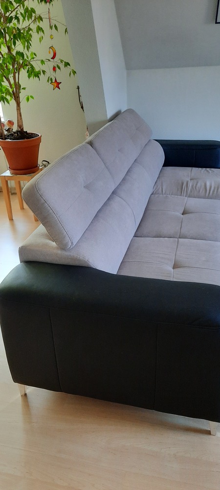 Kurzer Teil 1.20cm Breite 1m Langer Teil 2.64cn Breite 90cm Armlehnen und Rückwand schwarz Sitzfläche grau. Alle Kopfstützen sind verstellbar.