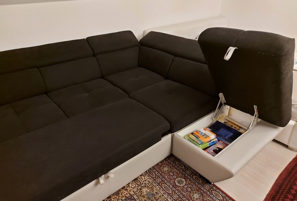 Dieses Sofa ist eine komfortable Eckeinheit mit hochwertigen Details, einschliesslich Eckverbindungen aus Metall und verstellbaren Kopfstützen und der Rückenlehne. Das Untergestell besitzt Rollen für die Mobilität. Die Sitzfläche ist aus Massivholz gefertigt, was auch bei längerem Gebrauch Komfort gewährleistet. Schaumstoff, der mit Kunstleder bezogen ist, sorgt für eine weiche Liegefläche. Es wiegt ca. 150 kg und ist hellgrau. Das Sofa ist 1 Jahr alt und so gut wie neu. Da ich umziehe, passt es nicht in die neue Wohnung. Es ist ab sofort verfügbar.