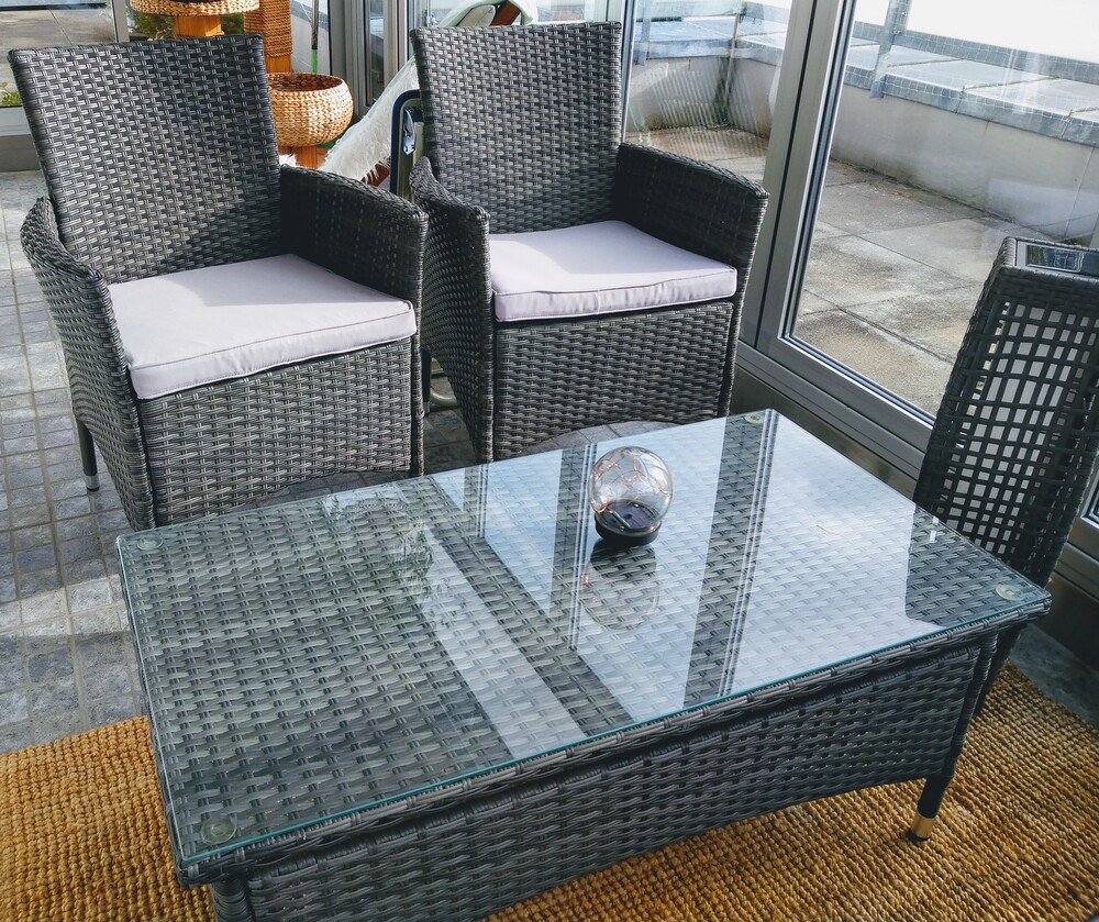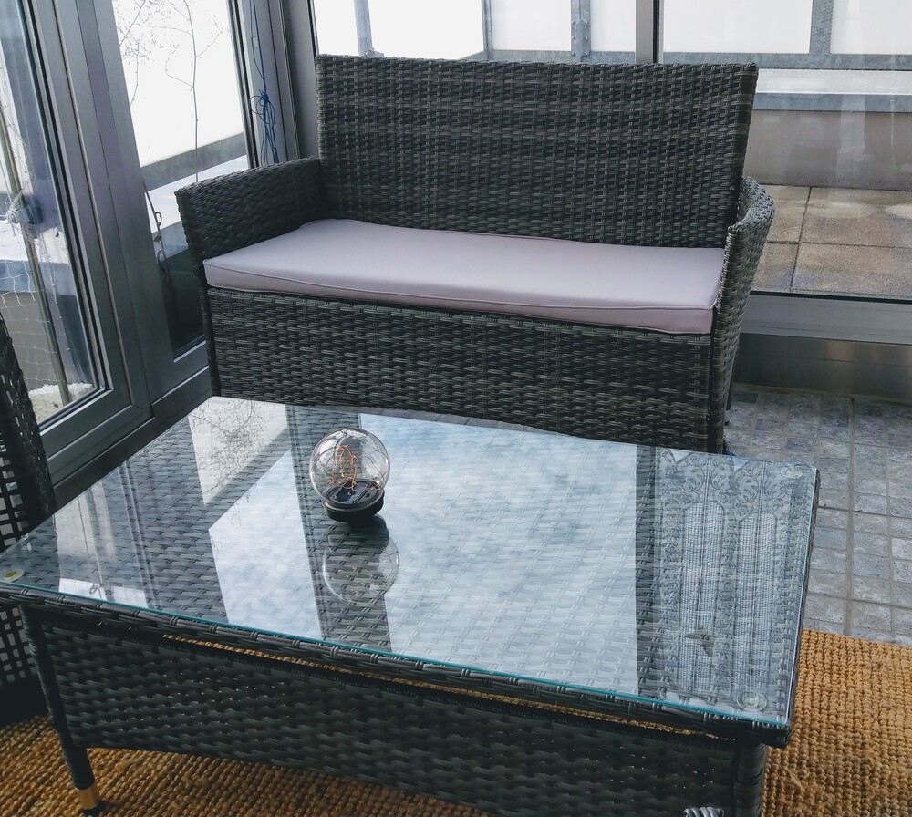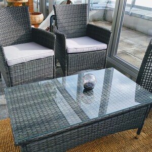 2 Sessel 1 Tisch mit Glasplatte 1 Sitzbank