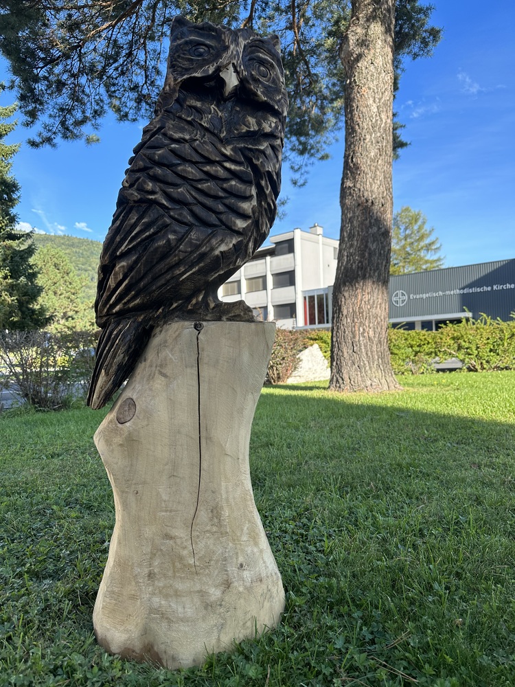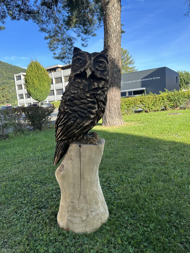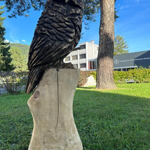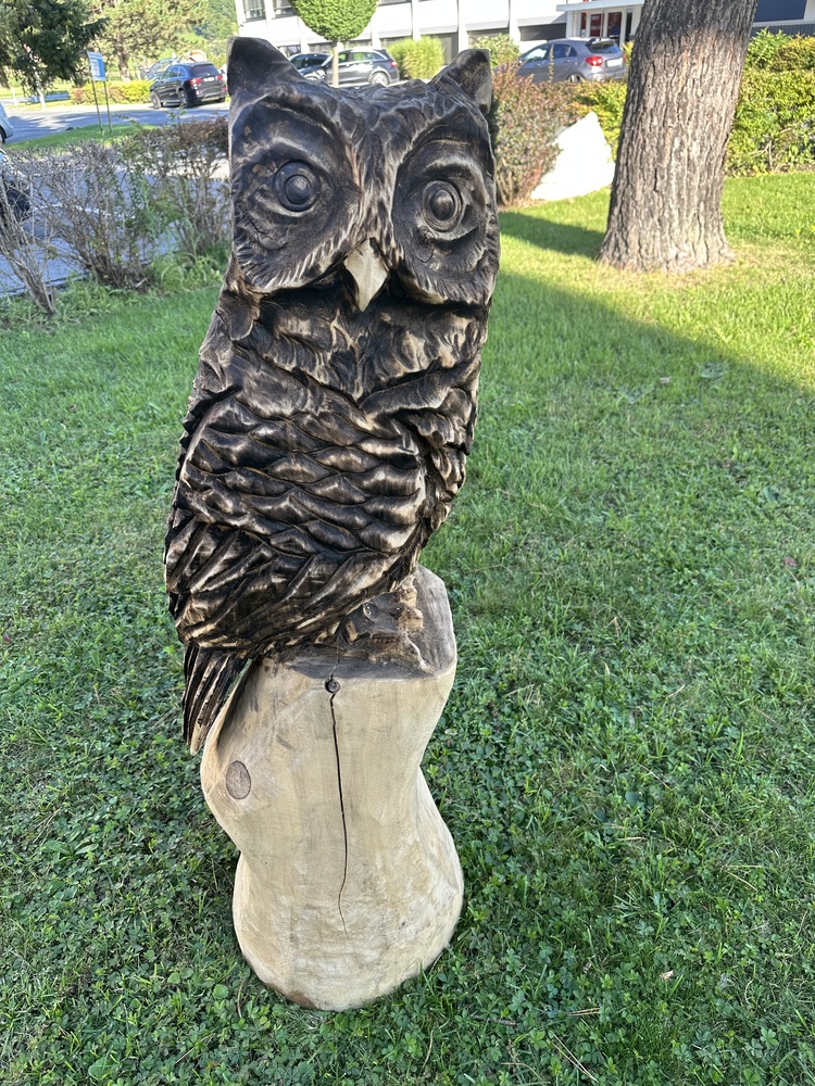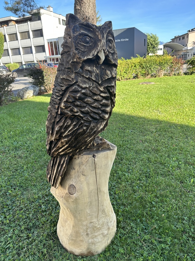Geschnitzte Eulenstatue aus Holz. Groose 120 cm