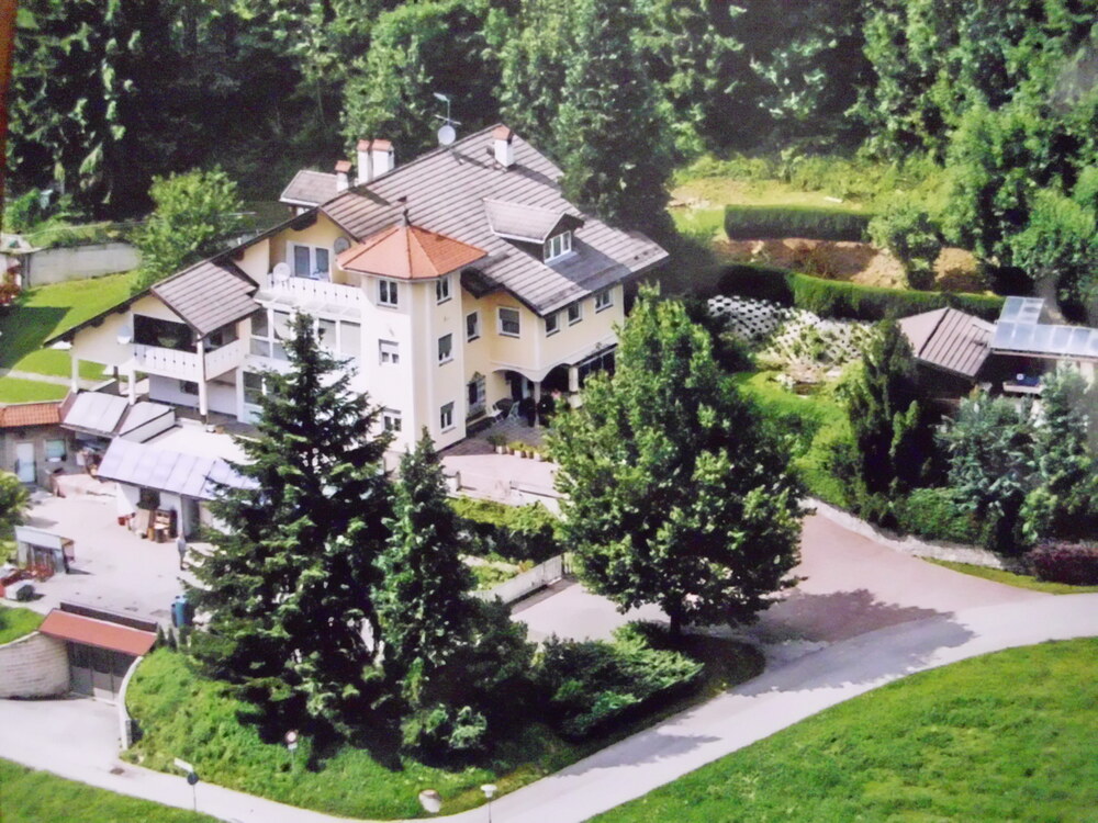 Verkauft wird ein herrschaftliches Haus in Waldnähe (aber dennoch sehr bequem mit dem Auto oder z. B. zu Fuß von der Bushaltestelle im Ortskern zu erreichen) mit mehreren Wohnungen, eigener Wasserquelle, Schwimmbad mit Liegewiese und Holzhäuschen, Gemüse-/Blumengarten, kleiner Fischteich, Wellnessbereich, Partyraum mit offenem Kamin, Tiefgarage, Solarwarmwasseraufbereitung, Pellets-/Fernwärmeheizung usw. in schöner Lage.