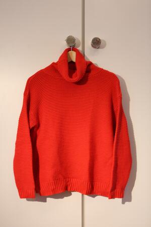 Hose mit hohem Bund. Farblich passender Gürtel. Vordertaschen. Blinde Gesäßleistentaschen. Reißverschluss, Innenknopf und Metallhaken vorne.