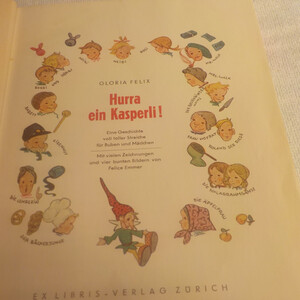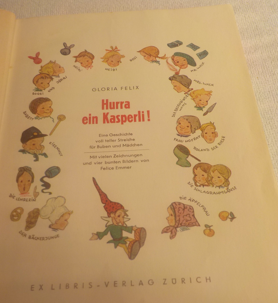 Hurra - ein Kasperli Buch von Gloria Felix/ Eine Geschichte voll toller Streiche für Buben und Mädchen / Zürich Ex Libris-Verlag / 1949. Mit farbigem Titelbild / 4 Farbtafeln u. zahlreiche Illustrationen / von Felice Emmer / 149 Seiten / 15x21 cm, 149 S. / Eckenleicht. bestoßen / fürs alter sehr guter Zustand