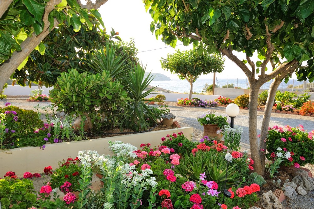 Das Gebäude steht in Einzellage auf einem 2000 qm grossem Grundstück, 1 km außerhalb von Mochlos. Der Garten ist begrünt mit vielen blühenden Pflanzen und kleinen Bäumen.