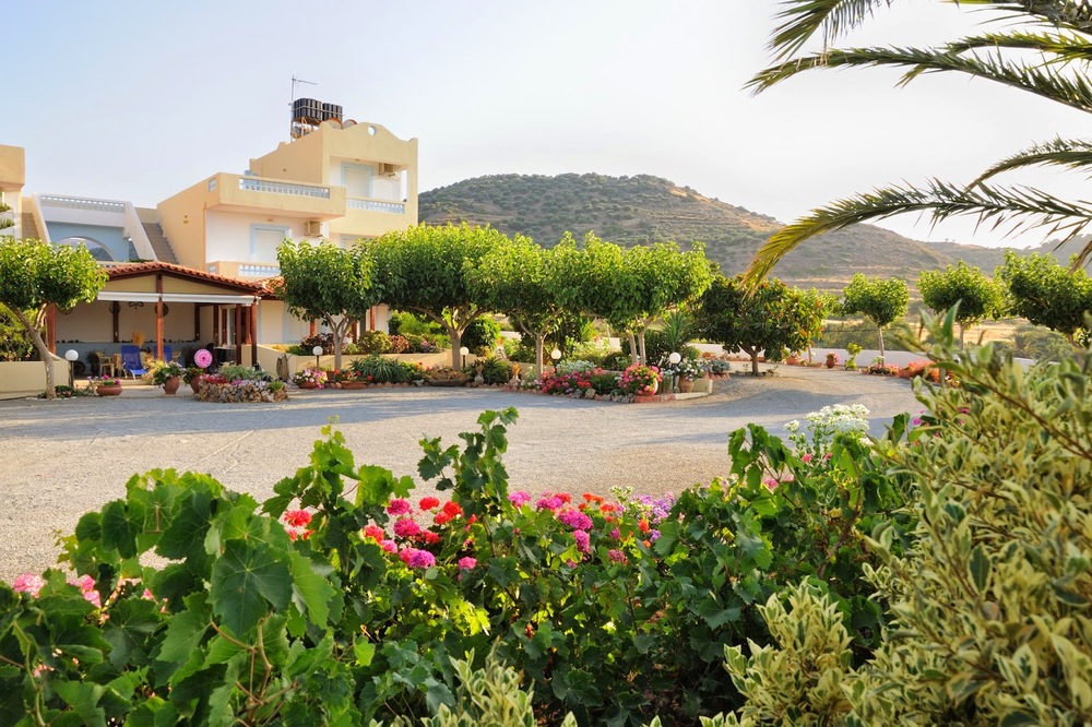 Das Gebäude steht in Einzellage auf einem 2000 qm grossem Grundstück, 1 km außerhalb von Mochlos. Der Garten ist begrünt mit vielen blühenden Pflanzen und kleinen Bäumen.