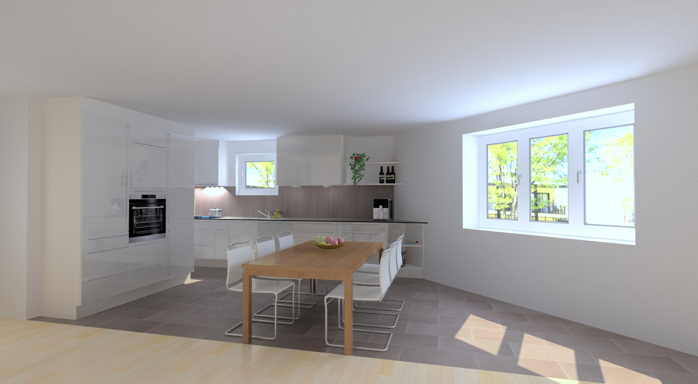 Grosszügige Küche mit modernen Geräten wie Geschirrspüler, Glaskeramikherd, hochliegender Backofen, grosser Kühlschrank, Gefrierschrank.