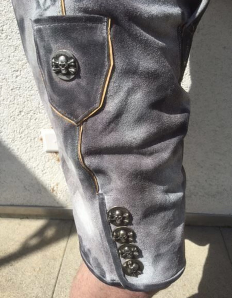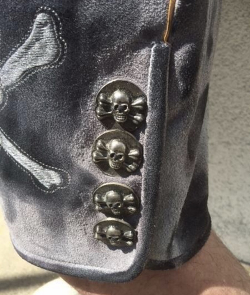 Schöne Totenkopftickereien schmücken die Hose, Gürtelschnalle Totenkopf, Knöpfe im Totenkopfdesign