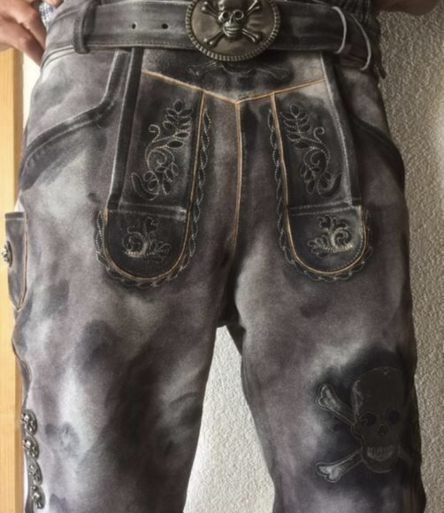 Eine Totenkopfstickerei in 3D unterstreicht einen sportlichen Look. Die exklusive Lederhose in grau vereint Tradition und Moderne.