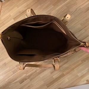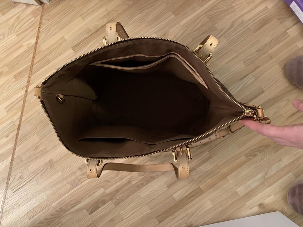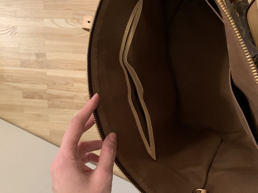 Hat von innen ein grosses und zwei kleine Fächer. Ist mit einem Reissverschluss verschliessbar.