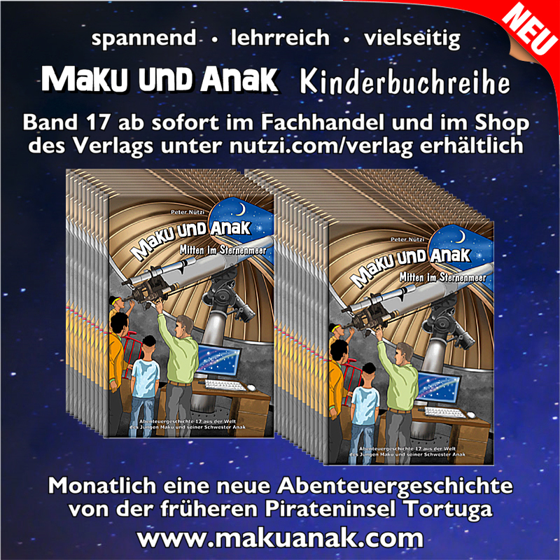 Heute besichtigen Maku und Anak mit Onkel Dizi die Königliche Sternwarte. Sie erhalten die Möglichkeit, den Mond und Planeten, die weit entfernt sind, ganz nah zu sehen. Ein Kollege von Onkel Dizi, der sich an der Universität der Hauptstadt von Tortuga mit dem Weltall befasst, erklärt den beiden Geschwistern auch unser Sonnensystem und nennt ihnen einen Satz, mit dem sie sich die Planeten, die um die Sonne kreisen, gut merken können. Wie mag dieser Satz wohl lauten?