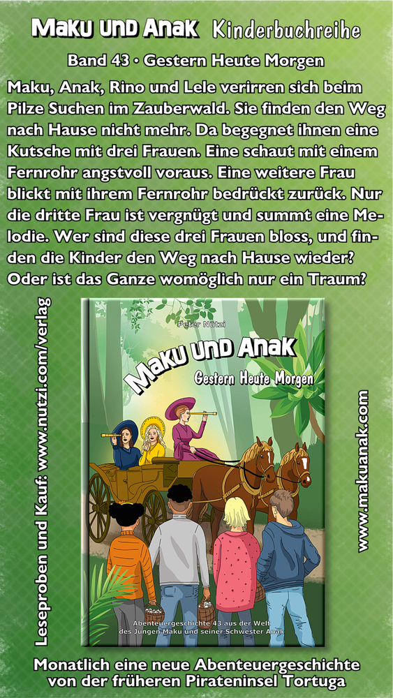 Maku, Anak, Rino und Lele verirren sich beim Pilze Suchen im Zauberwald. Sie finden den Weg nach Hause nicht mehr. Da begegnet ihnen eine Kutsche mit drei Frauen. Eine schaut mit einem Fernrohr angstvoll voraus. Eine weitere Frau blickt mit ihrem Fernrohr bedrückt zurück. Nur die dritte Frau ist vergnügt und summt eine Melodie. Wer sind diese drei Frauen bloss, und finden die Kinder den Weg nach Hause wieder? Oder ist das Ganze womöglich nur ein Traum?