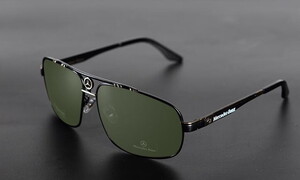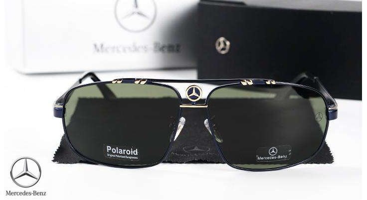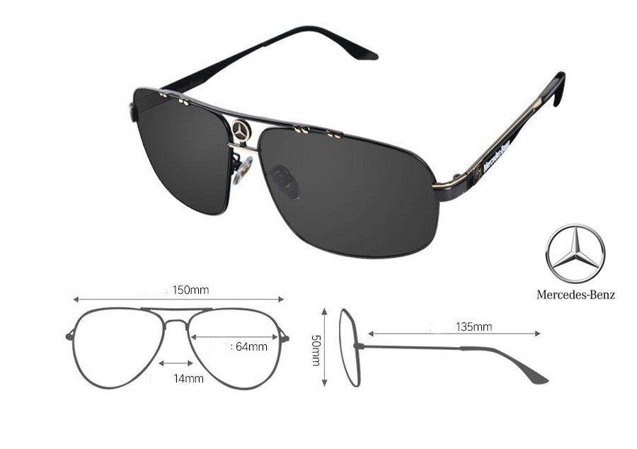 Edle Mercedes-Benz Sonnenbrille in Schwarz mit Metallrahmen und Mercedes-Benz Logoplättchen & Schriftzug auf beiden Bügeln. Hochwertige Polaroid Gläser, einem Stylischem Benz Logo in der Mitte der Sonnenbrille, 100 % UV-A-, UV-B- und UV-C-Schutz bis zu 400 nm.