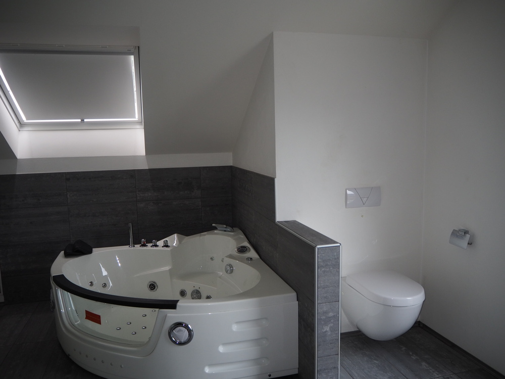 Über die Glastreppe gelangen Sie in das Obergeschoss, wo zwei grosszügige Schlafzimmer, eines davon mit begehbarem Kleiderschrank und ein modernes Badezimmer mit Dusche und Whirlpool auf Sie warten.