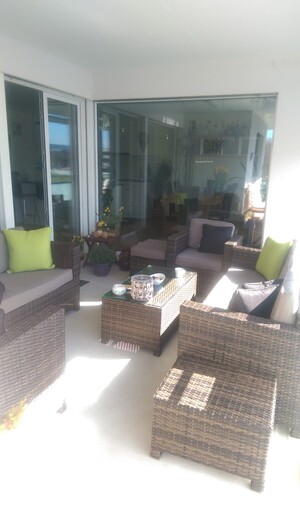 Rattan Lounge (1x 2er Sofa - 1x 3er Sofa und 2 Sessel) mit 2x Tischen (Glasplatten) inklusive Zierkissen, Sitz und Rückenkissen. ebenfalls eine grosse Aufbewahrungsbox mit Innentasche. So ist alles gegen Nässe geschützt.