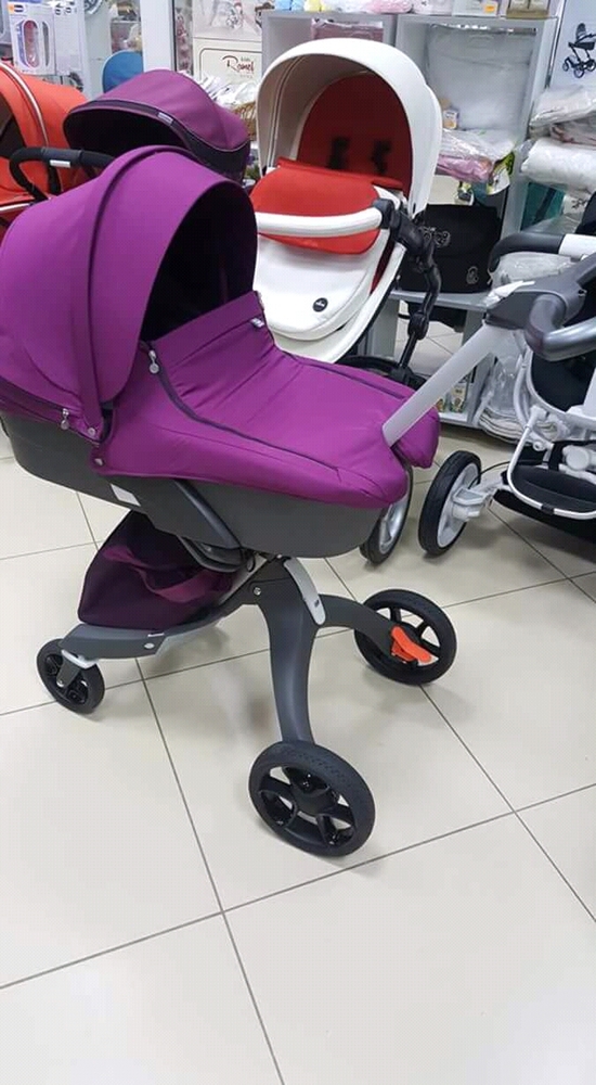 Stokke Xplory Gestell, Kinderwagensitz, Verdeck, Blendschutz, Babyeinlage für Sitz, Griff für Sitz, 5-Punkt-Sicherheitsgurt, Fußstütze, Einkaufstasche, Regenschutz, Moskitonetz.