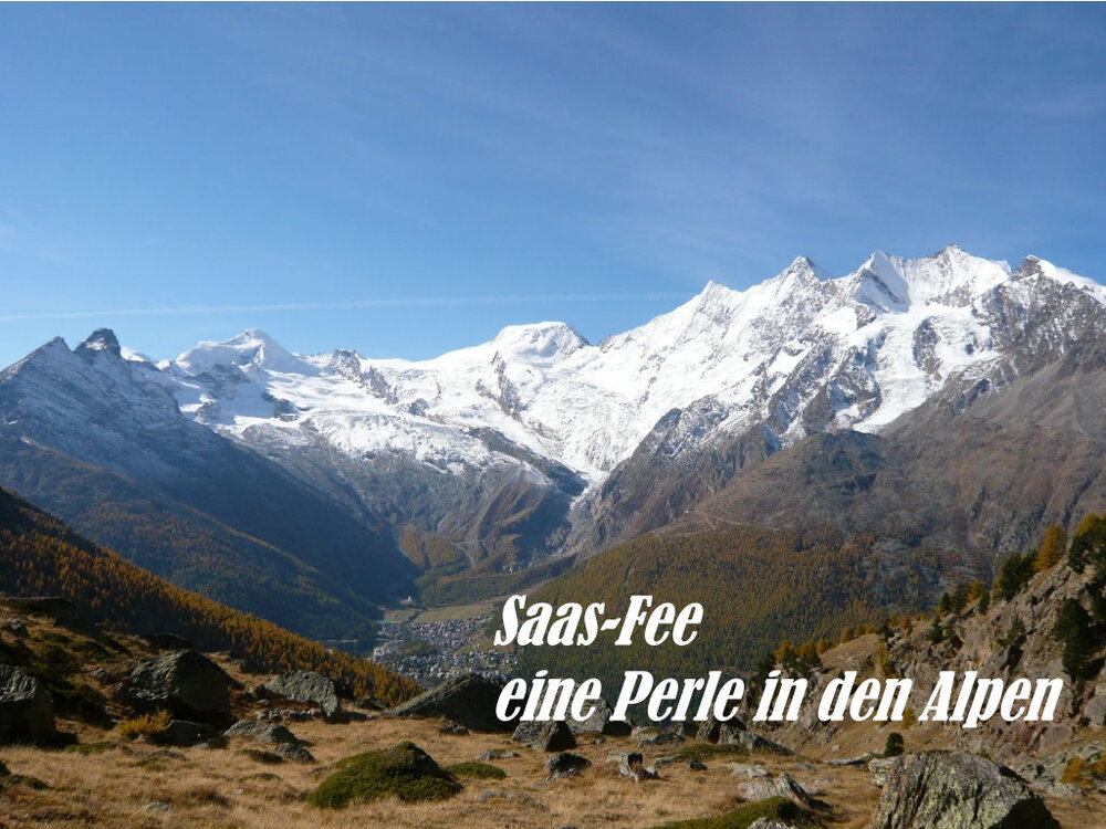 Saas-Fee, ein Skigebiet auf einem Schneeparkett mit Talabfahrt ins Dorf. Südliches und mildes Klima; herrlichen, alpine Landschaften und im majestätischen Bergkranz eingebettet das Dorf Saas-Fee.