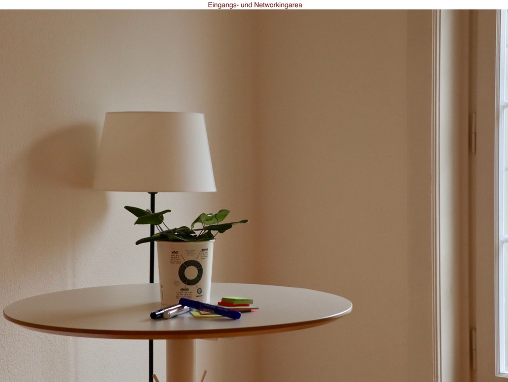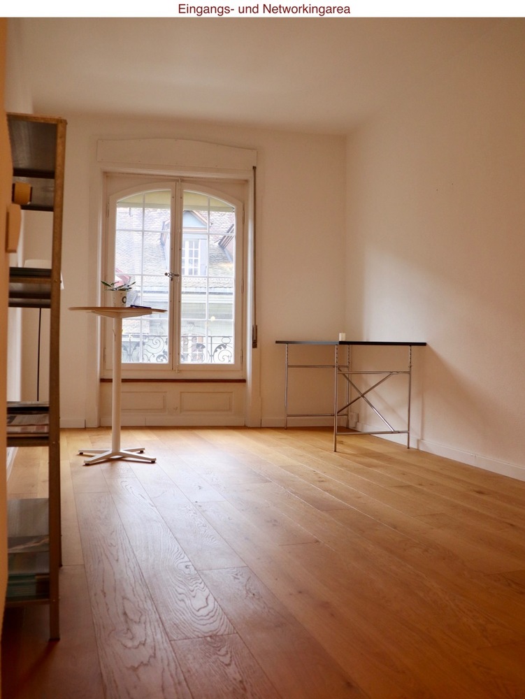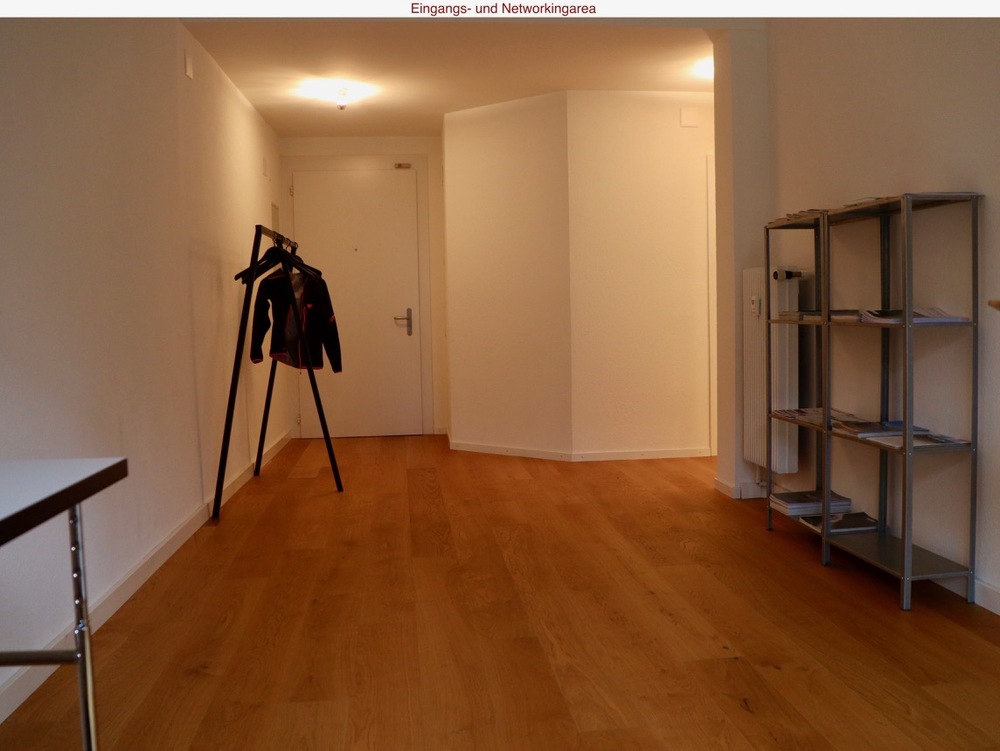 Weitere gemeinsam genutzte Räume sind die Eingangs- und Networkingarea, das grosse Sitzungszimmer (8-10 Plätze) sowie Küche/WC. Die Networkingarea wird noch ausgebaut, dabei möchten wir aber die Wünsche unserer zukünftiger Coworkers berücksichtigen.