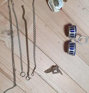 Dachbodenfundstücke Uhrenketten defekt, Strass-Ansteckbrosche, kleines zweiteiliges Gefäss mit blau...